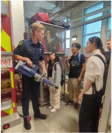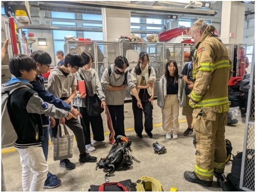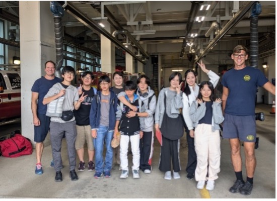 消防署見学では消防車や道具などを一通り見せてもらい説明を受けた後、本当の出動要請があり、消防士の皆さんは現場に出動していきました。緊迫した場面に立ち会うことができました。写真の消防士さんは身長2メートルぐらいあると思います!